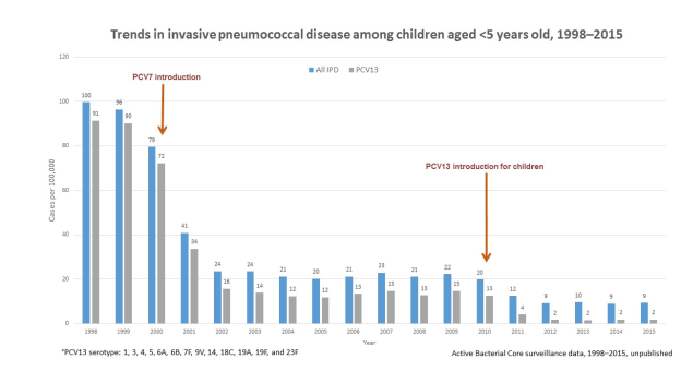 The first vaccine for S. pneumoniae in US was cleared in 1977. The first conjugate vaccine in the US was in 2000, PCV7. The current vaccine PCV13 was cleared by the FDA in 2010, it vaccinates against 13 types rather than 7 but is otherwise the very much the same vaccine. The blue bars in the graph below are for invasive infections from all strains of the bacteria, the gray bars are those covered by the PCV13 vaccine.