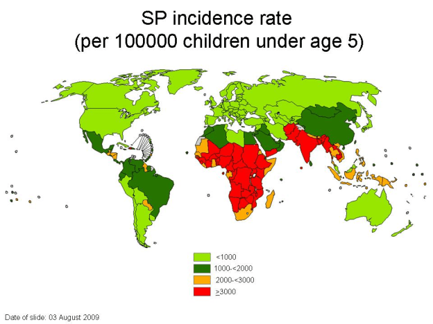In 2000, there were 14.5 million pneumococcal cases worldwide, in children under 5 years. 735,000 of those were fatal. The following maps depict the distribution of these cases.
